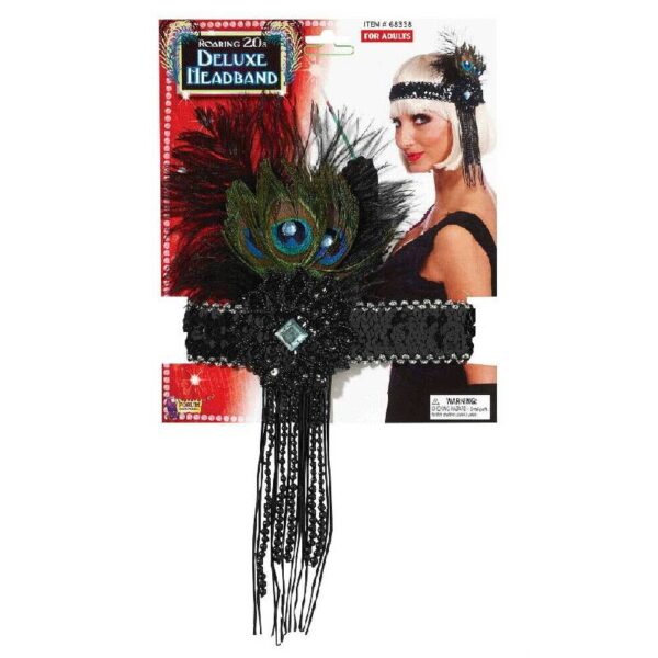 This attractive Flapper Headband is made of Black Sequins and Beads. There are peacock feathers, an Ostrich feather and Blue Jewels as well. Strands of black beads hang down the side to make it even more deluxe.
