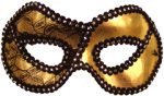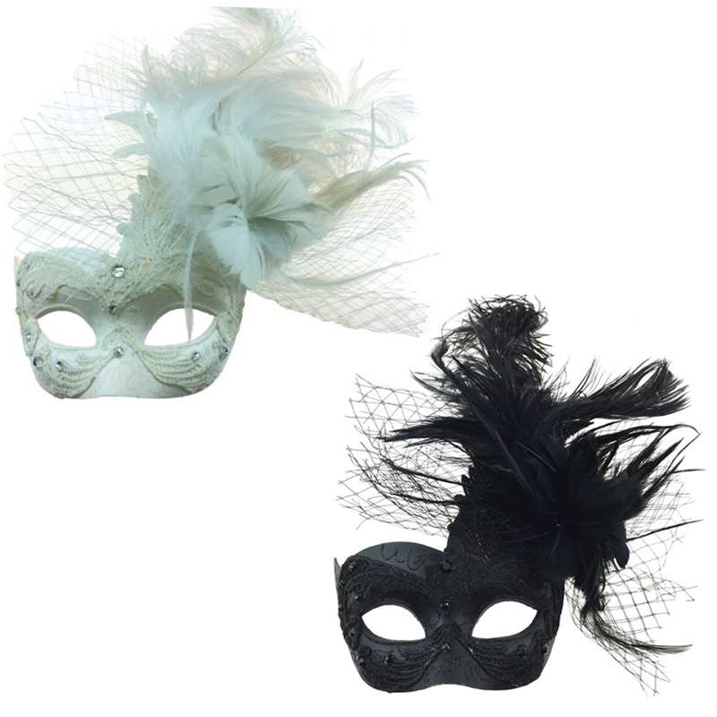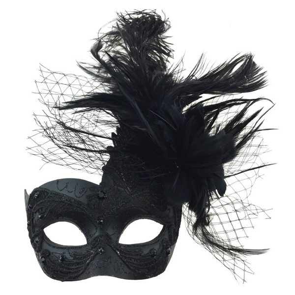 Costume Deluxe Venetian Half Mask features netting beautiful feathers that match the glittered mask. Tie this mask in place with the attached black ribbons. This is a beautiful mask that you can wear even while you eat and drink at a party. You could wear this for a Mardi Gras party mask, or any masquerade party!