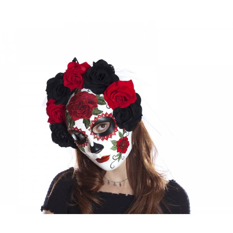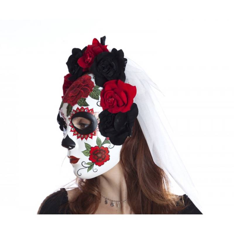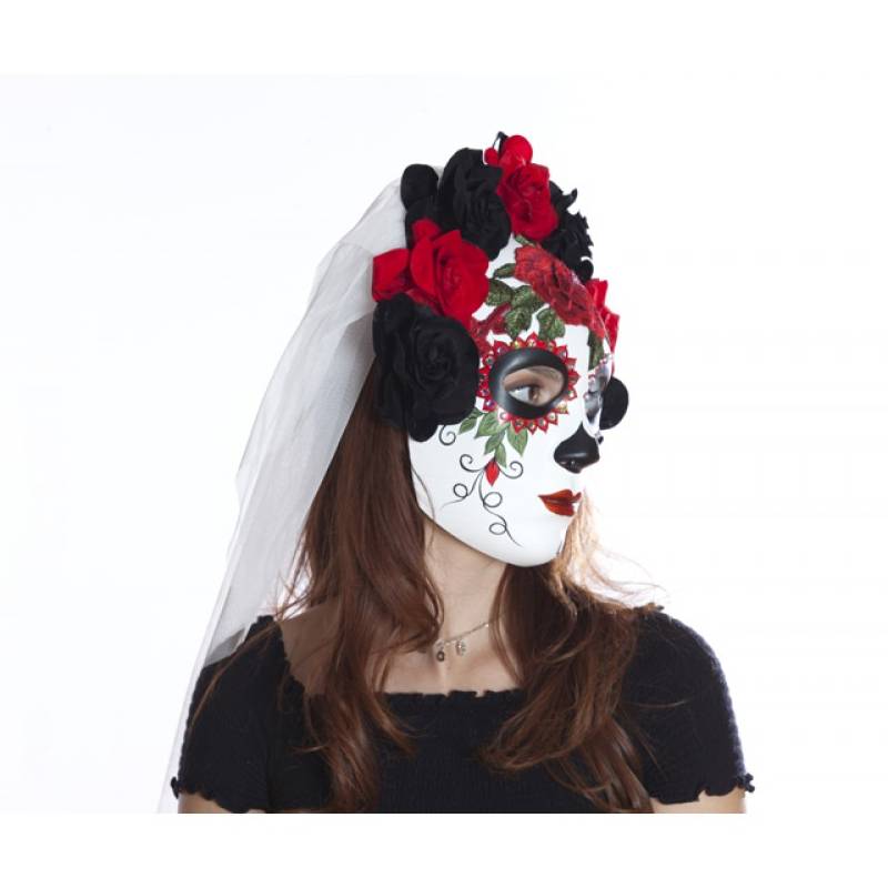 Costume Embroidered Floral Day of the Dead Mask is beautifully decorated. It has a white veil flowing off the back.