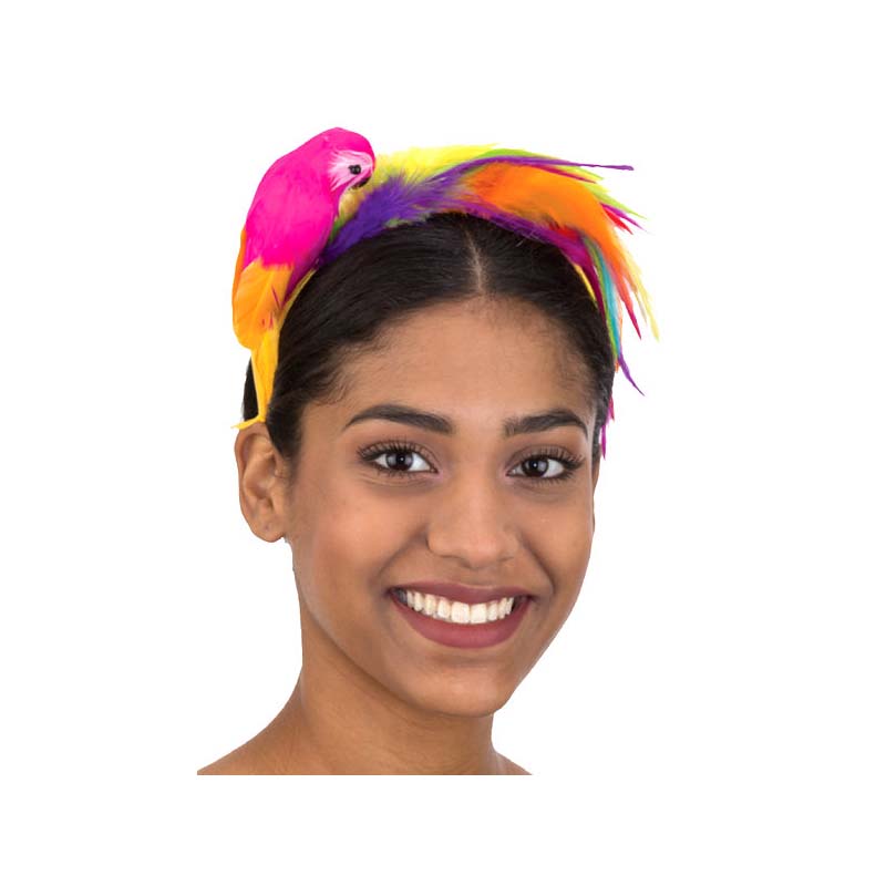 Wear a Costume Feathered Parrot Headband to your next Hawaiian Luau or tropical themed pool party! Yellow-ribbon covered headband features a 5″ parrot and bright feathers!