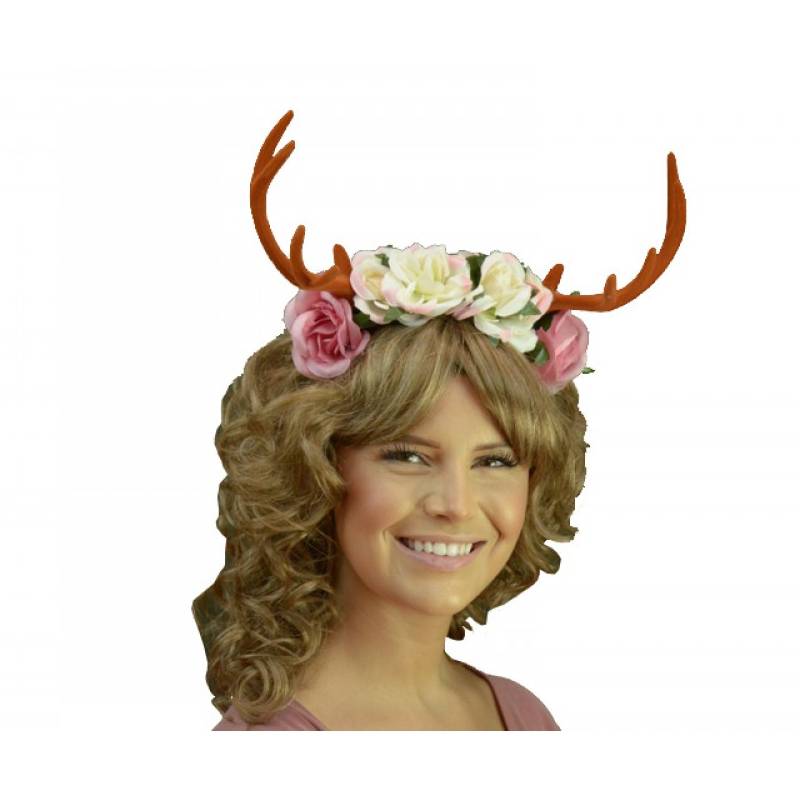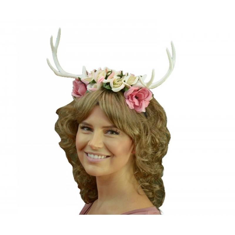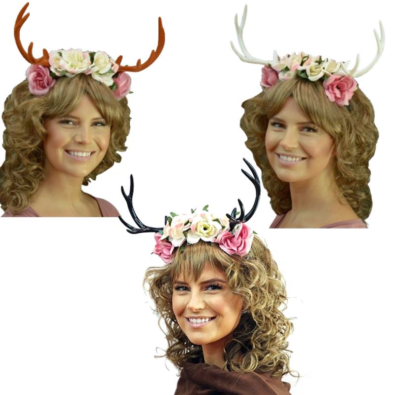 Costume Floral Headband with Antlers are attached to a plastic headband covered in soft black material. Choose from black, brown or white. You could wear this for Halloween, a Renaissance Festival, Themed wedding, parties or Oktoberfest.