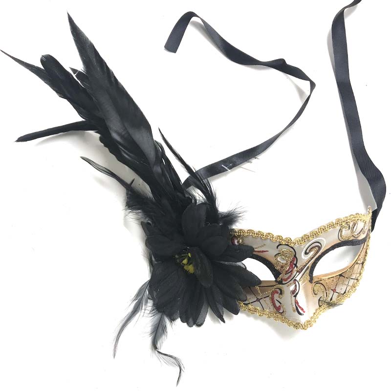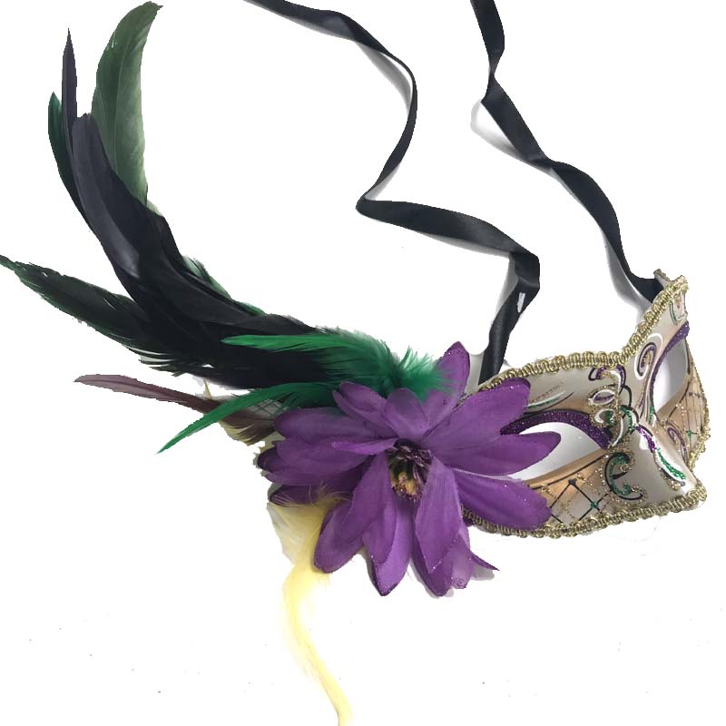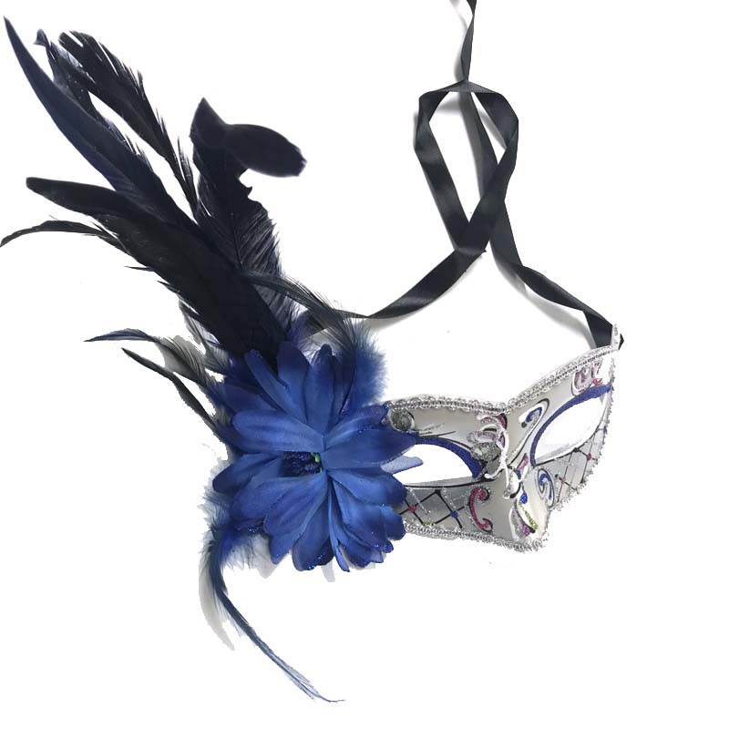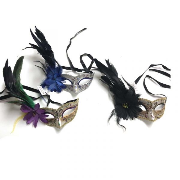 Wear a beautiful Costume Glittered Venetian Half Mask that features a flower and feathers on the right side. Choose from 3 color combinations.