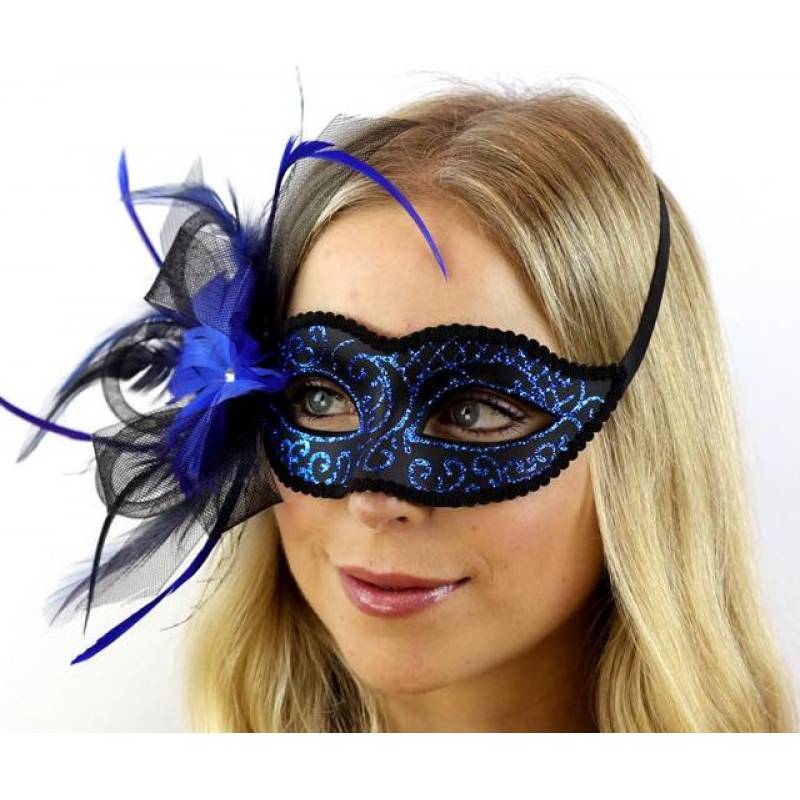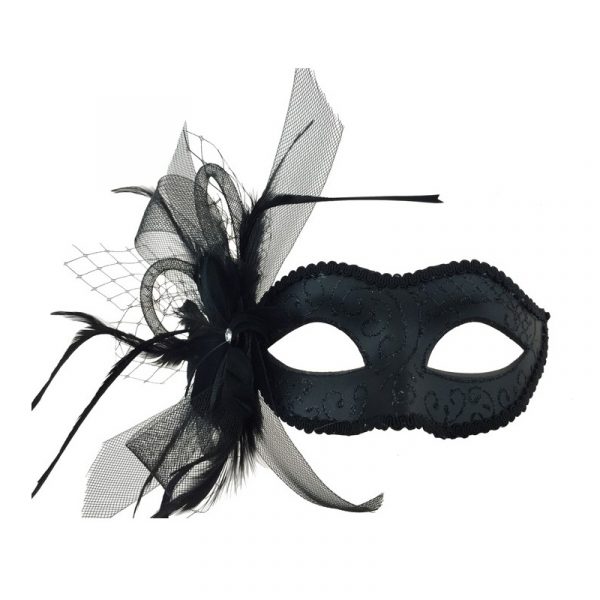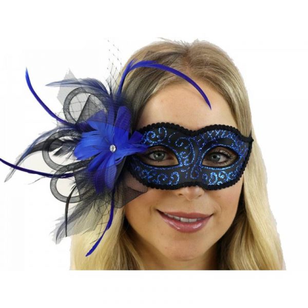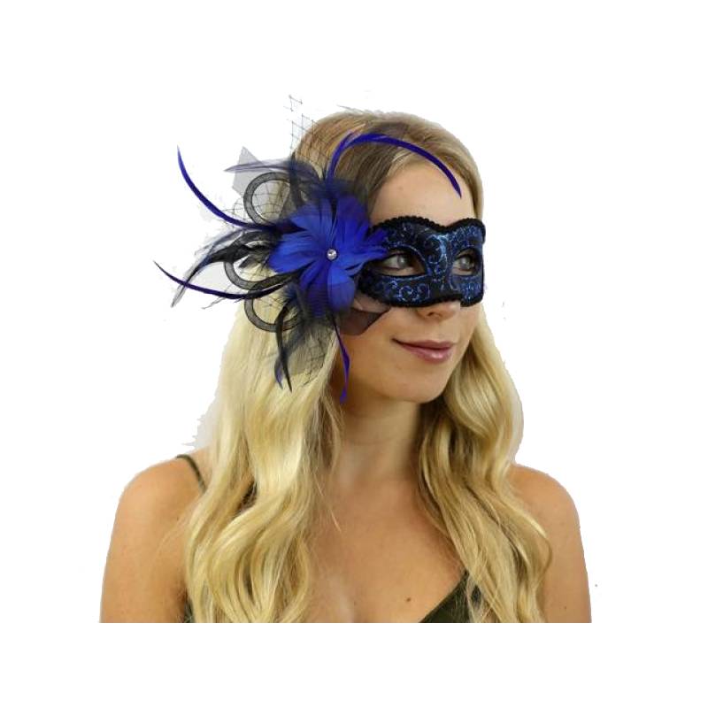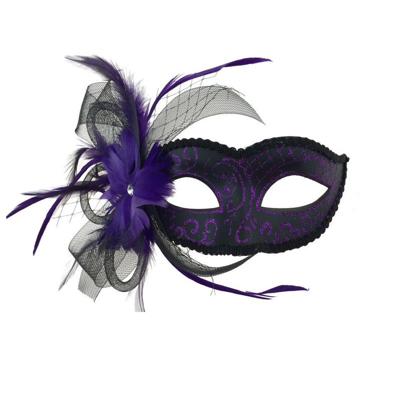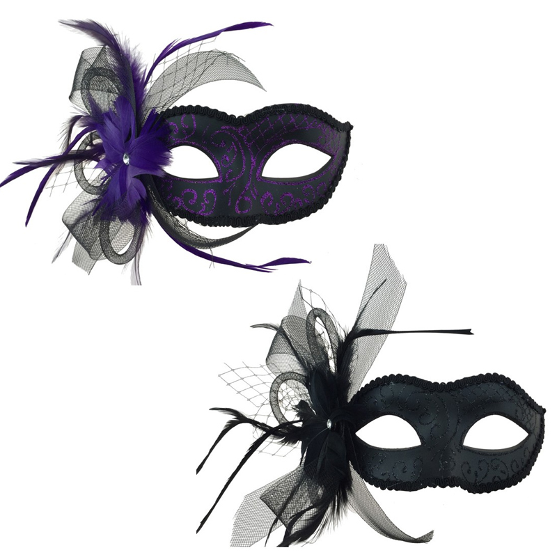 Costume Glittered Venetian Half Mask features beautiful feathers and netting that match the color of the mask. Tie this mask in place with the attached black ribbons. This is a beautiful mask that you can wear even while you eat and drink at a party. You could wear this for a Mardi Gras party mask, or any masquerade party!
