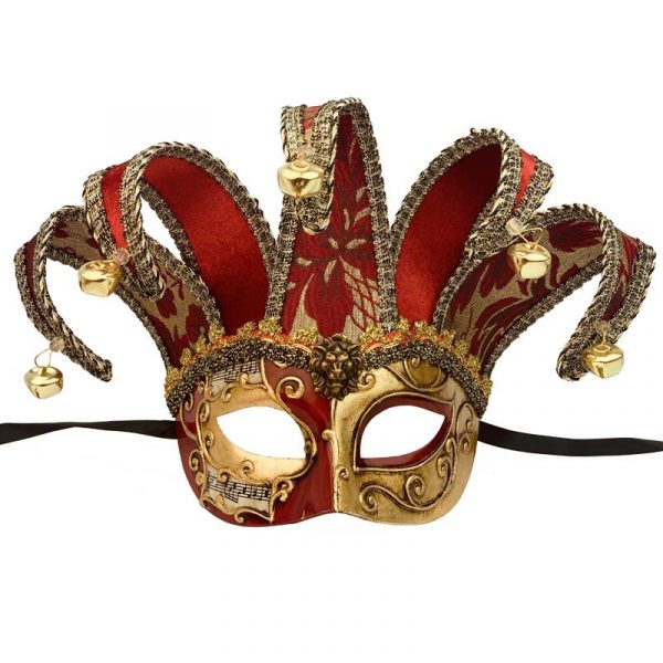 Quality plastic mask with music note painted detail. Featuring a high jester crown with bells. Choose from 3 different colors.