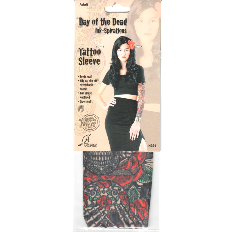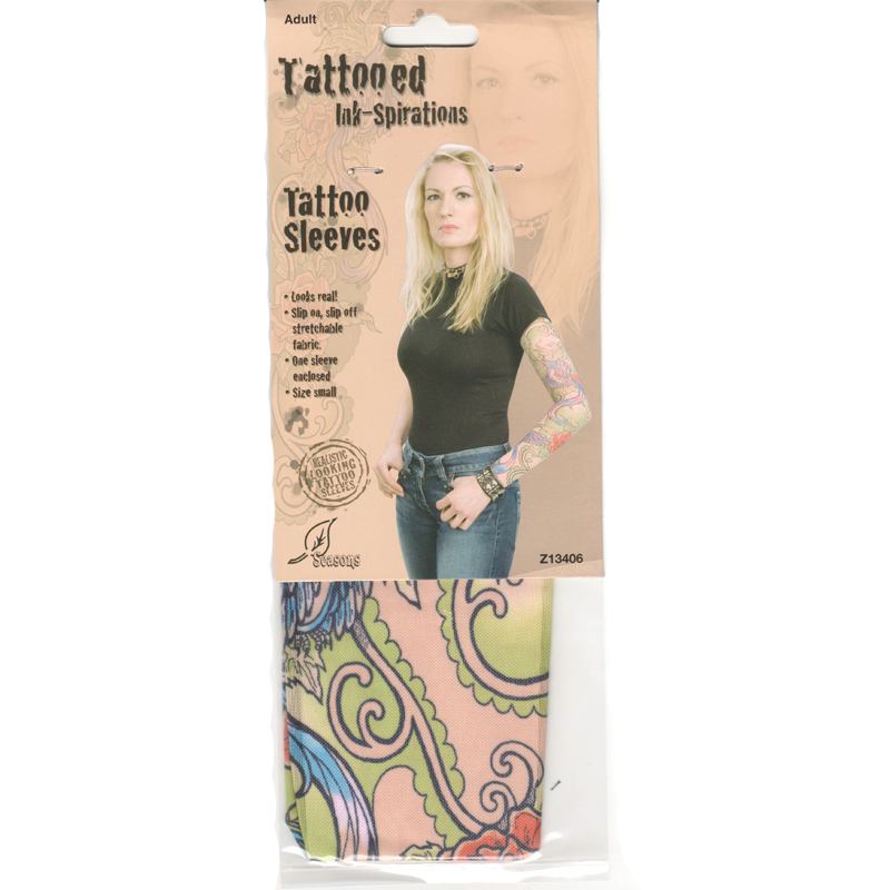 Costume Ladies Printed Tattoo Sleeves come in 4 different designs: fairies and swirls, Day of the Dead, True Hollywood and feathered wings and flowers. One sleeve per package.
