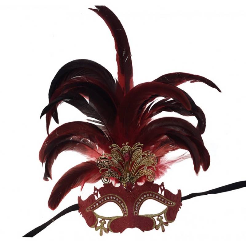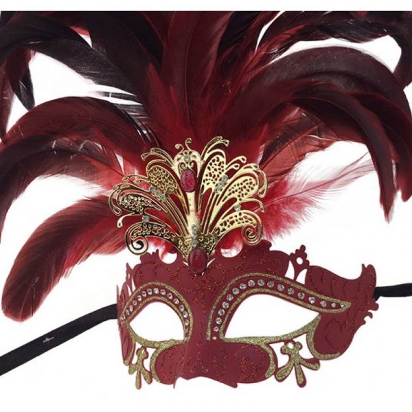 This beautiful half mask is decorated with rhinestones and flared with feathers. Wear this for Halloween, Mardi Gras, themed parties, plays, and more.