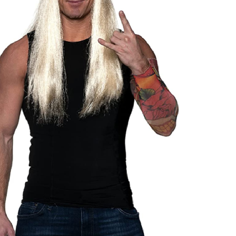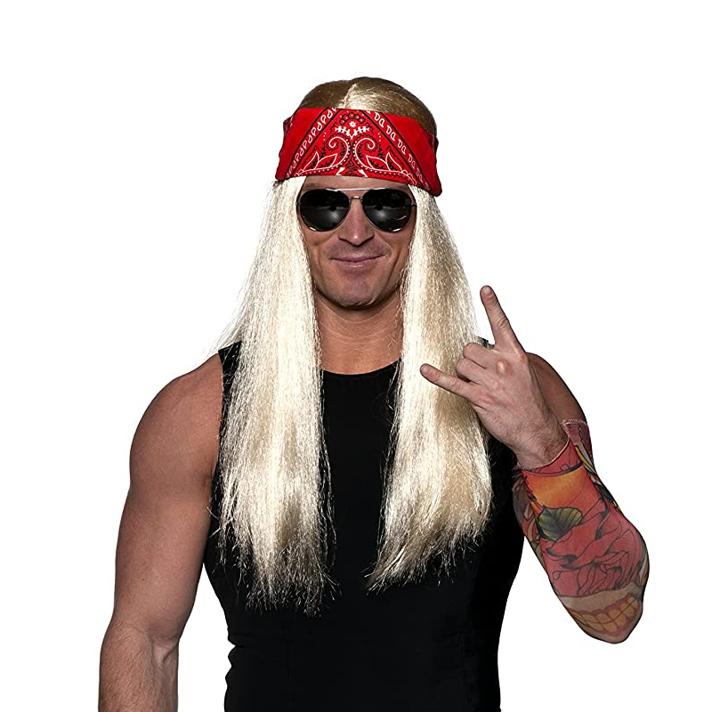 Costume Metal Rocker Accessory Kit includes a long blonde wig, red bandana headband, and a tattoo sleeve. The wig has an elastic under cap ensuring a comfortable fit all night. The tattoo sleeve also has stretch to it. Pay homage to a young Axl Rose, the steamy bad boy singer for Guns and Roses. This can be used for costumes. Wear this for 80’s themed parties. This rocker accessory kit is great for Halloween, plays, productions, drag, cosplay, themed parties, or just for fun. This fits most adult and teen head and arms.