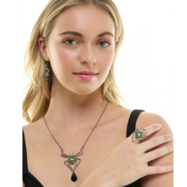 The spider is made from a silver alloy, and the band is a durable metal. Its design is a large spider with legs pointed in a diamond shape. The size of the spider is approximately 1 1/2 inches in length, and it has a light green gemstone that’s around the size of a fingernail in its center. Some of the spider’s legs are big enough the cover a portion of the adjacent fingers. The ring’s band is large enough to fit any finger, and can stretch to accommodate anyone’s hand size.