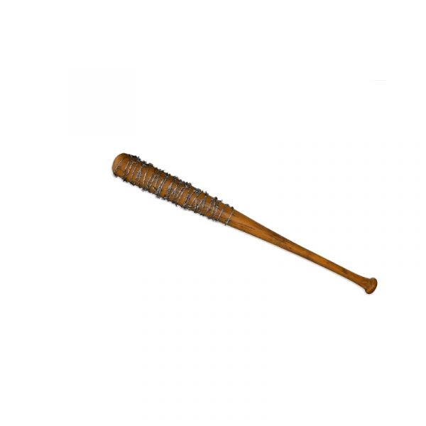 32″ Costume Plastic Barb Wire Zombie Spoiler Bat. This bat represents the one used by The Walking Dead villain Negan. It has silver painted “barbwire” going around the bottom half of the bat. Red paint blood spatters surround the bat.