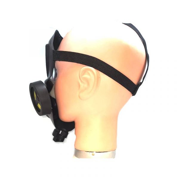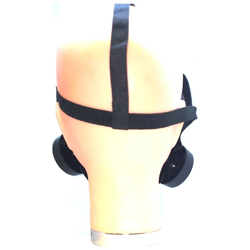 The respirator has holes for easy breathing and communication. Inside the mask there are 2 cushions to protect your face from the plastic. It holds securely to you with two elastic bands- one around your head and one over which loops through.