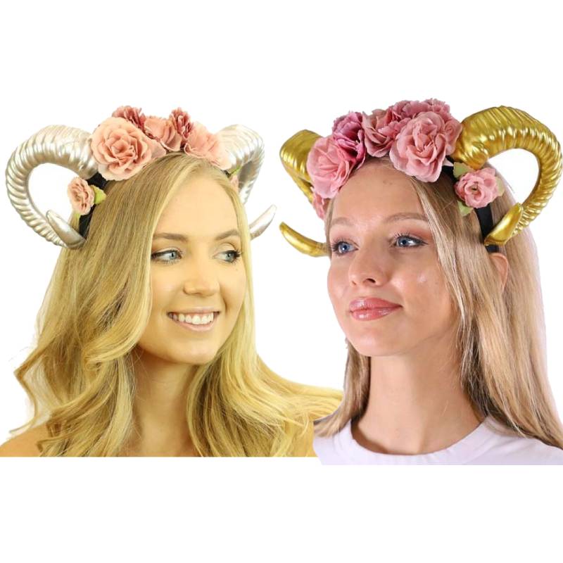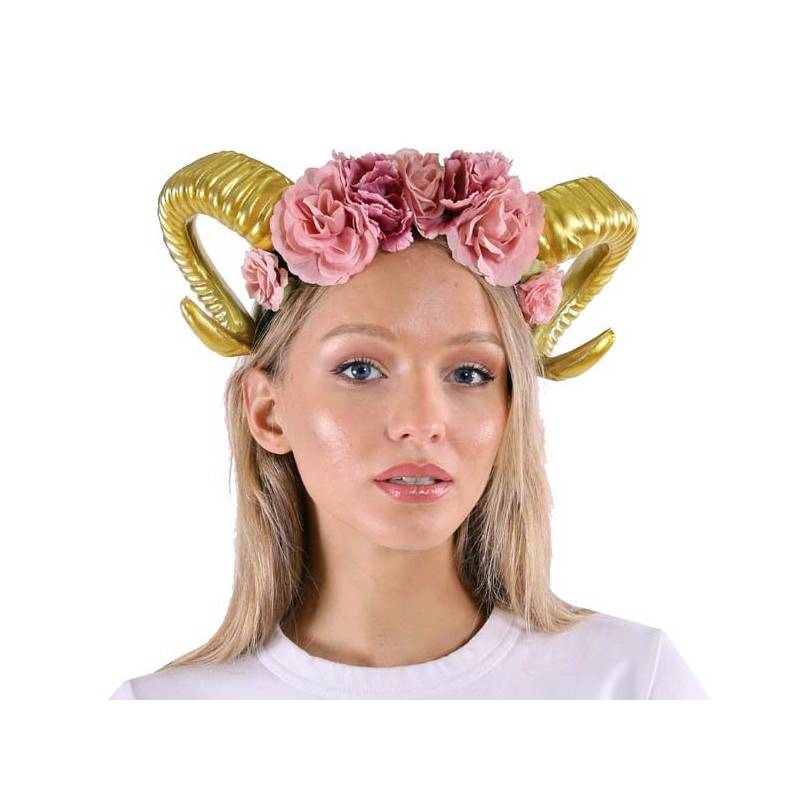 Costume Ram Horns Headband w Floral Trim is attached to a snap-on headband covered in soft material. Wear this for Halloween, themed parties, cosplay and play productions. Buy this for fantasy parties. Rose colored flowers line a black headband.