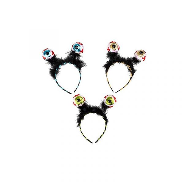 Costume Sequin Eyeballs Headband comes in 3 different eye colors: blue, green and gold. Iridescent and red vein like sequin surrounds the eye.