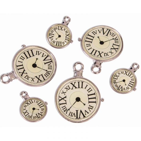 Embellish your Halloween Costume with Steampunk Assorted Clock Charms! Package includes six pieces in assorted sizes. Each charm is a silver-backed clock with Roman numerals.