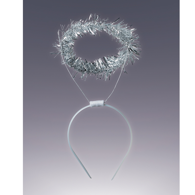 This halo sits on a white headband. Silver tinsel wire holds the halo above the headband.