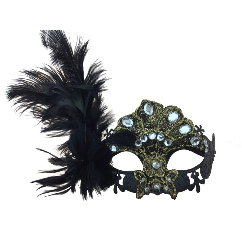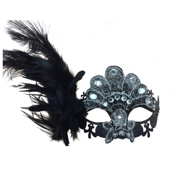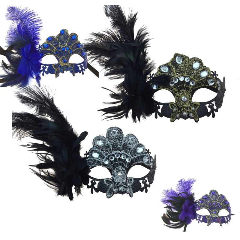 Costume Venetian Half Mask features beautiful jewels and ostrich feathers. Tie this mask in place with the attached black ribbons. This is a beautiful mask that you can wear even while you eat and drink at a party. You could wear this for a Mardi Gras party mask, or any masquerade party!