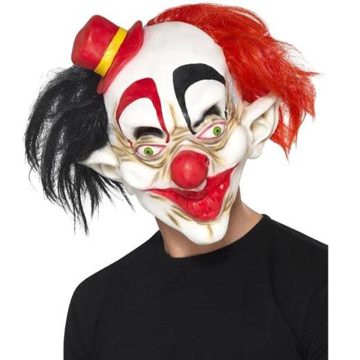 This creepy clown mask has exaggerated features, with a wide, leering grin stretched unnaturally across its face. The eyes wild, surrounded by heavy, exaggerated black and red makeup that gives the impression of dark, soulless pits. The skin is pale and ghostly, with cracks and wrinkles adding to the unsettling appearance. Additionally, the nose is exaggerated, giving the impression of a grotesque caricature. Overall, the combination of exaggerated features and a sinister expression would evoke a feeling of unease and fear in those who encounter it.