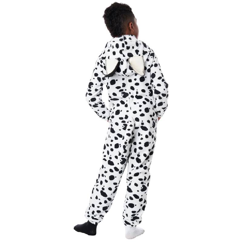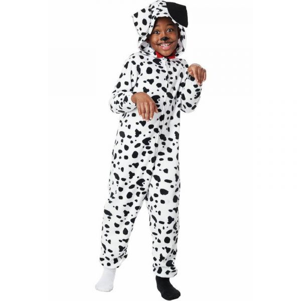 Dalmatian Pup Childs Fleece Jumpsuit is such a cute and easy costume. This jumpsuit has an attached hood with ears. The tail is attached with velcro so it is easy to take off or put on. The red collar is sewn in. It has a front zipper.