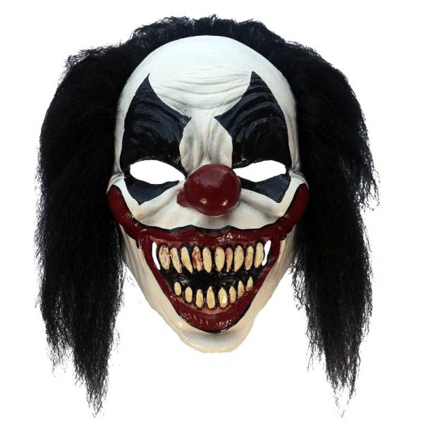 - Is a scary killer clown mask with harlequin makeup and large sharp teeth