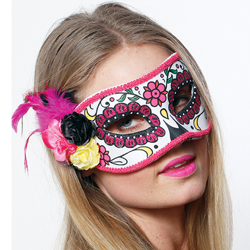 Costume Day of the Dead half mask with yellow, pink, and black flowers at the corner of the right eye. Mask is trimmed with pink rick rack. Eyes are beautifully decorated with pink glitter outlining black eyelashes. The mask has small yellow swirls and a pink flower in the center of the forehead. This day of the dead half mask has an elastic strap to hold it securely in place.