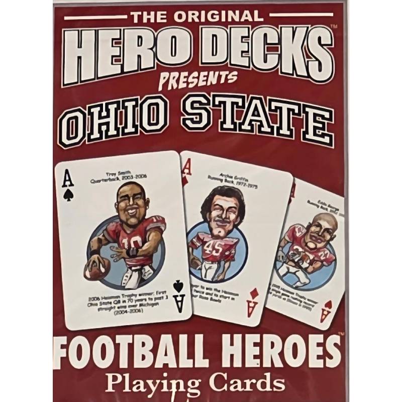 This Hero card deck is a regular size deck of cards. The deck includes fifty-two greats from Ohio State Football History. Each image features a caption underneath to tell you what it is.