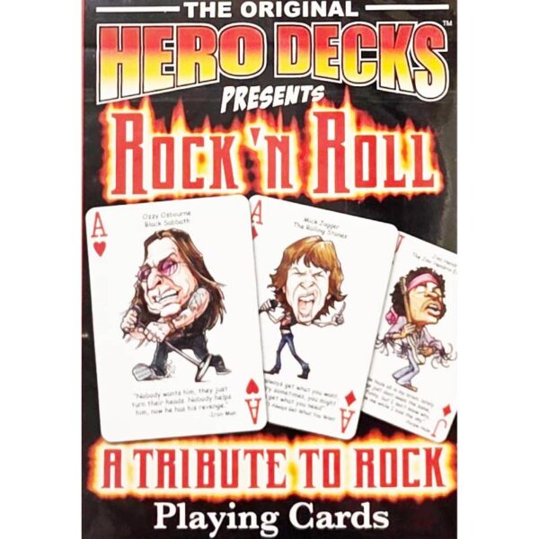 This Hero card deck is a regular size deck of cards. The deck includes fifty-two greats from Rock n’ Roll History. Each image features a caption underneath to tell you who it is.