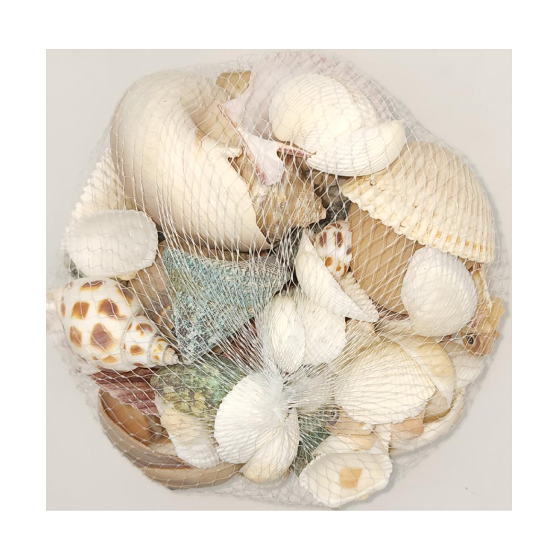 Buy this mesh bag of Decorative Assorted Seashells, It weighs 12 oz and contains a variety of shells and colors. These are natural sea shells so some may be chipped.