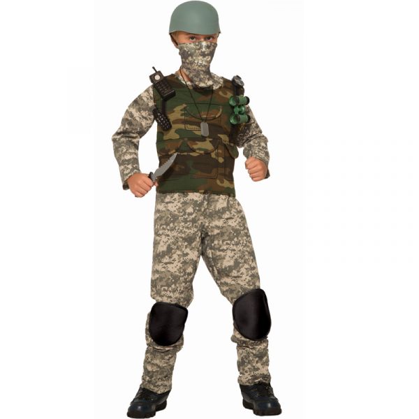This child size Combat Trooper military combat camouflage Halloween costume includes lots of accessories to complete a full military costume: