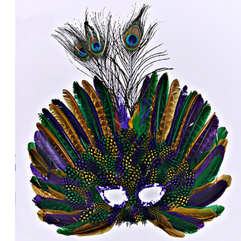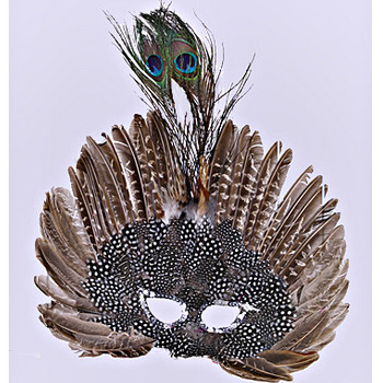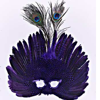 Deluxe Feathered Face Mask With Peacock Top is created fully out of Peacock feathers. This mask comes in Purple, Natural, and Purple/Green/Gold. The feathers start at the nose and the feathers are dotted. As the feathers fan out the spots get larger until they eventually become a solid color. In the middle there are 2 standard Peacock feather.