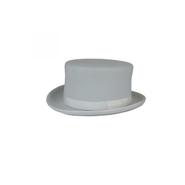 This short felt Tuxedo Top Hat is gray and features a gray grosgrain ribbon band and inner elastic hat band. The edge is nicely finished with a lighter gray felt.