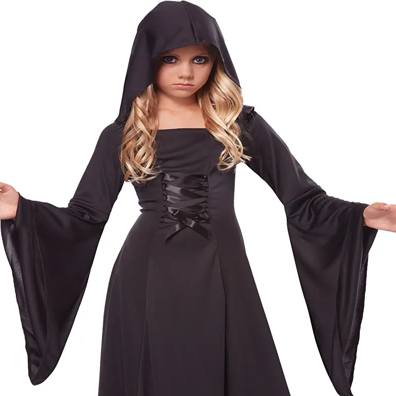Cast a spell of total cuteness with Hooded Robe Child Size. Look delightfully dark and spooky. This deluxe robe is black and features a robe with attached hood, long flared sleeves, and lace up ties across the bodice. Wear this for a witch, sorceress, countess or gothic look. This robe will look great! This hooded robe can be worn for Halloween, themed parties, cosplay, and productions. It comes in 3 different sizes: Medium, Large and X-Large. All in the color black.