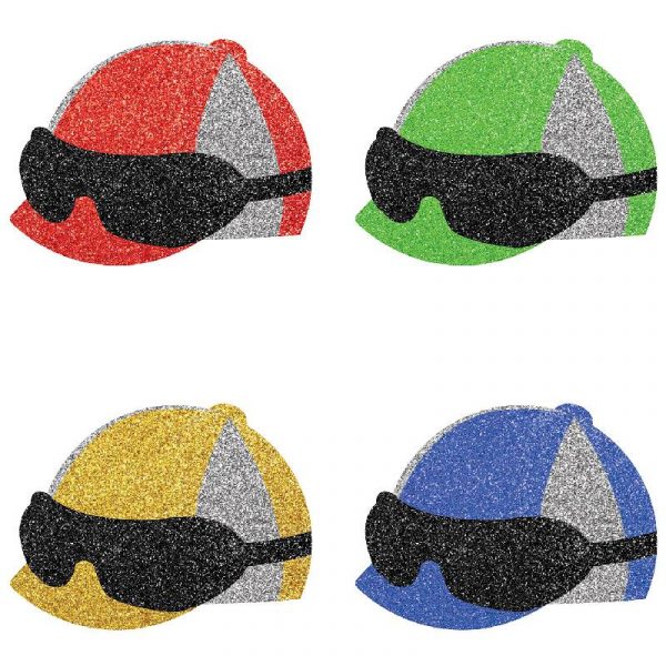 Decorate your table without the mess of glitter. Use Deluxe Sparkle Jockey Helmet Confetti for crafts or Kentucky Derby horse-race party decor. Package includes 2″  sparkly jockey helmets with black riding glasses.