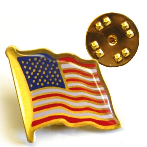 Deluxe US Waving Flag Pin is a gold brass metal pin that sticks through fabric and has a separate back. The American flag has a wave to it and has a shiny clear lacquer over it.