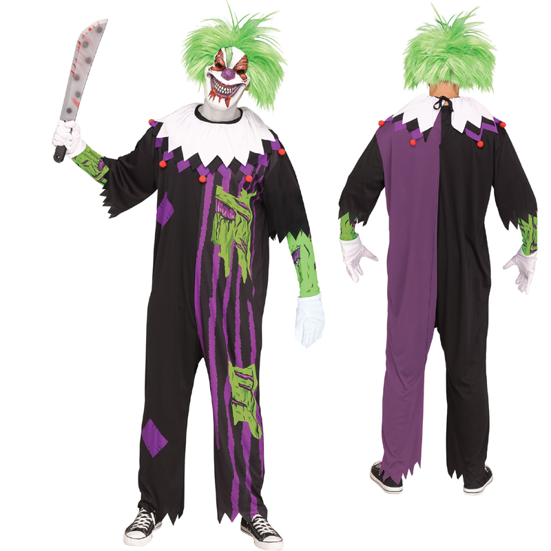 The Demented Clown Costume is available in standard size, and fits most adults. It includes: Clown Jumpsuit, collar, sleevelets, gloves, frightening mask with hair.