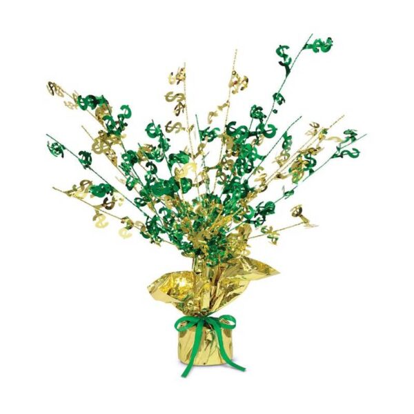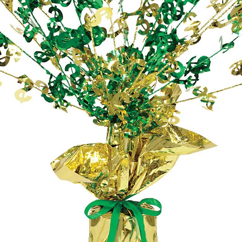 Dollar Sign Gleam N Burst Centerpiece is Gold and Green Mylar. It is weighted at the bottom for stability. The wires bursting out each have dollar signs on them and can be bent and shaped as you like.