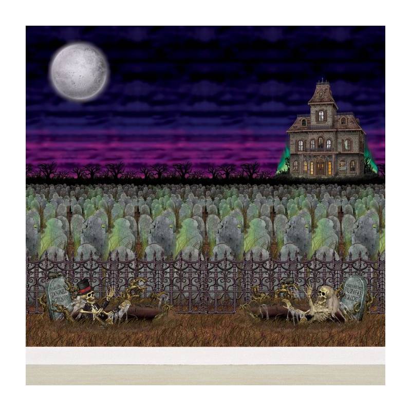 Doomed Groom and Buried Bride Props measures 33½” x 5′ 3″. The props are separate. They are skeletons coming out of graves with dead grass, rats and spooky birds.