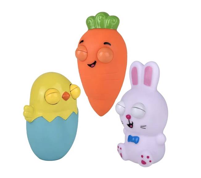 Squeeze tight and watch this Easter Figure w Popping Eyes’ eyes pop out! Choose from the Bunny, the Carrot, or the hatching Chick. Or, buy an assortment!