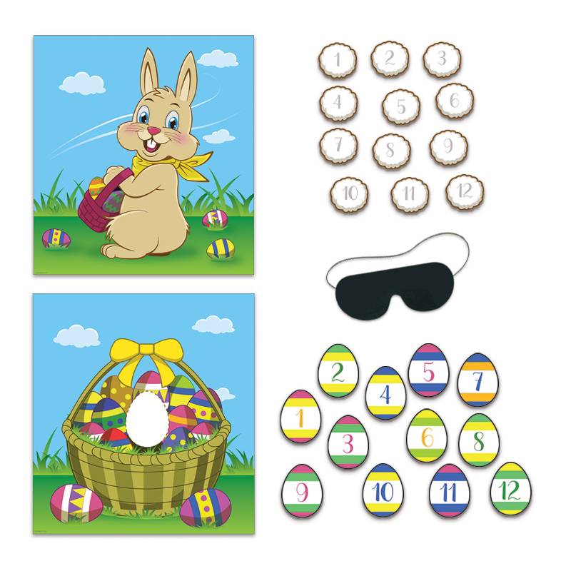 Easter Party Games are a great way to celebrate with friends and family of all ages! They measure 19″ x 17.5″ each. Blindfold mask, 12 eggs and 12 tails included. 2 games per package.
