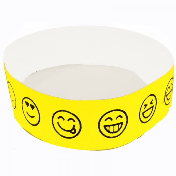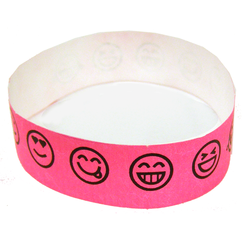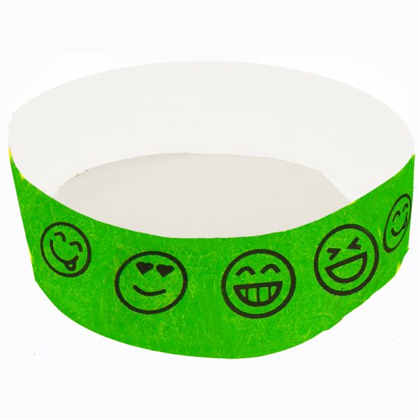 Emoji Smiley Wristbands. Tyvek single-use wristbands feature Neon Colors. Each wristband includes five designs of emoji smiley faces. The design repeats once on each wristband. The smiley faces are printed in black ink on the neon wristbands.