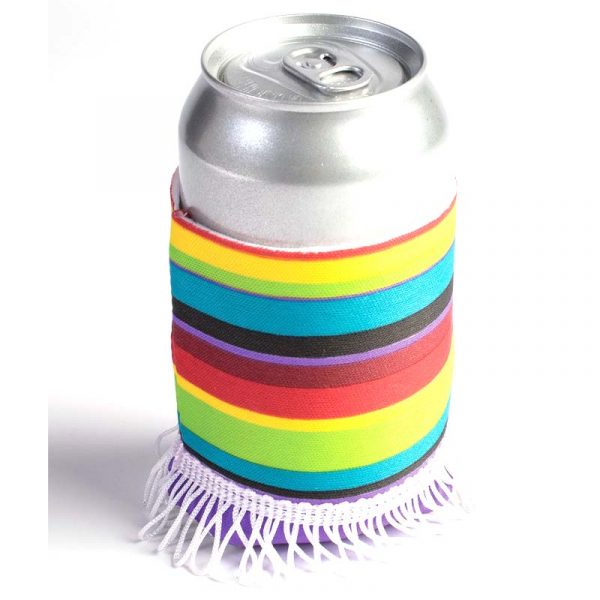 Give a Fabric Fiesta Serape Can Koozie- to every guest at your Cinco De Mayo party! This can koozie is lightweight, features colored stripes and ivory fringe.