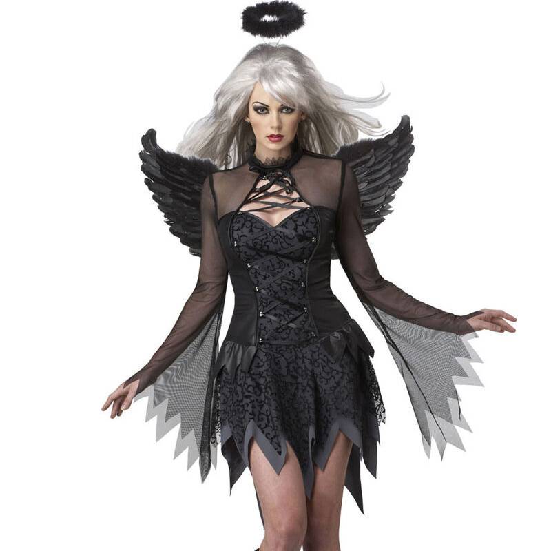 Fallen Angel Adult Costume is accentuated by a flattering lace-up neckline and dramatic tattered bell sleeves in delicate black mesh. The skirt is comprised of flocked mesh overlay with slimming curved princess seams for an added hourglass effect. the skirt is triple-layered and tapers to the back for coverage and effect. The beautiful feather wings and halo are included. Boots not included. Wig sold separately. Buy this for Halloween, themed parties, cosplay, drag, and theatrical performances.