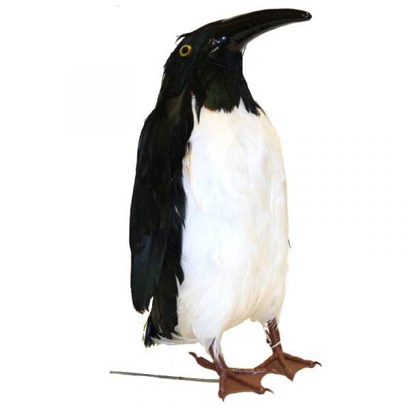 Feather Penguin measures 9″ x 4″ x 4.5″. The wings are not moveable but they are only attached at the shoulders. The feathers are black iridescent with a white chest. The beak is about 3″ long. The eyes are yellow with black pupils. He has brown feet with a 4″ bendable wire attached to the back.
