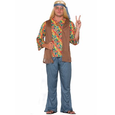 Wear this Flower Child Mini Dress and Matching Headband to a 60s or 70s party! This adult costume features a soft velour fabric with brightly colored flowers and peace signs.