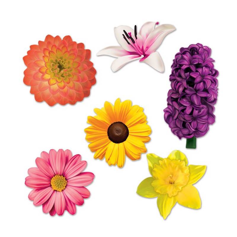 Flower Cutouts comes in a pack of 6. Use these for bulletin boards or window decorations. Hang these in classrooms, event centers, and more!