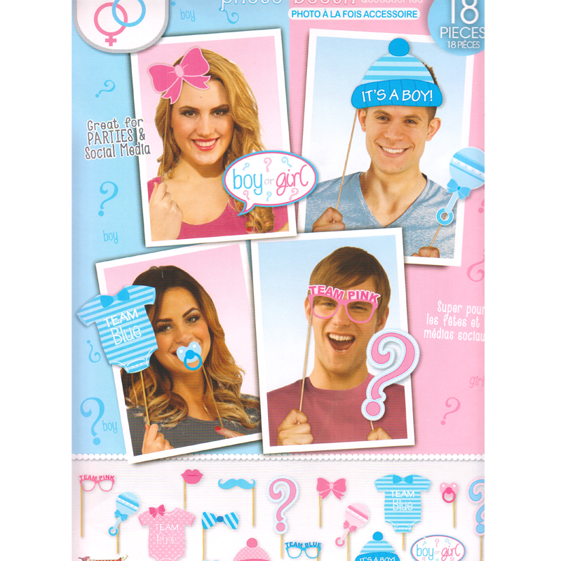 - 9 pink photo props on sticks including Team Pink eyeglasses and onesie, and It’s a girl skull cap