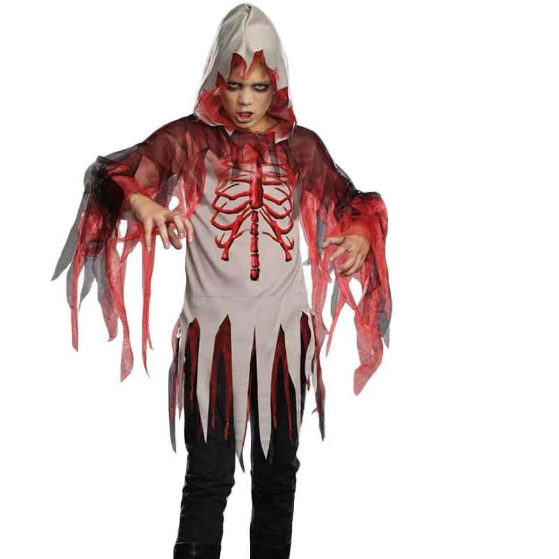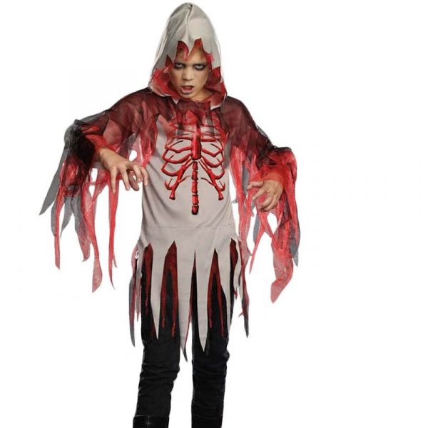 Ghouls Out for Summer is a hooded tunic with multi-layered sheer drapes of shredded black and red material on hood and sleeves. Tunic is beige. It has a red rib cage and is shredded with red layering.