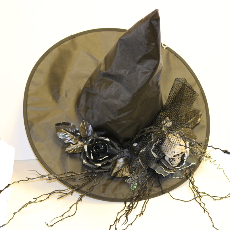 Glittered Black Satin Witch Hat with Skull and Roses measures 15″ tall. The brim is 5″ wide. The head space is about 8″. A skull, black roses with silver glitter detailing, mesh and black glittered twigs decorate one side of the hat.