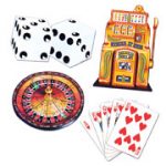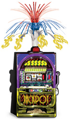 This Glittered Streamer says “CASINO”. It’s black and red and has the card suits at the ends of the word. The “S” in Casino is a $.