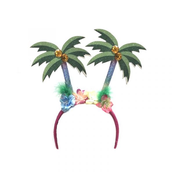 Wear this cute Glittered Luau Palm Tree Headband with silk flowers to create a fun tropical-party atmosphere! Wear it for a Hawaiian Luau or pool party! Total height measures 5.5″ tall.