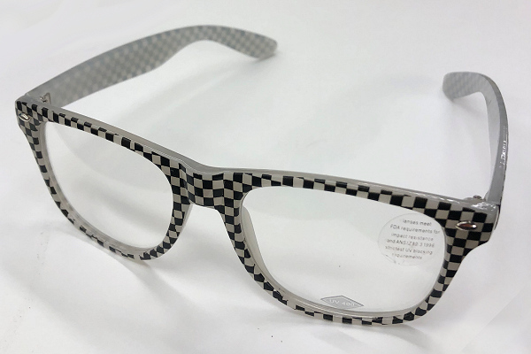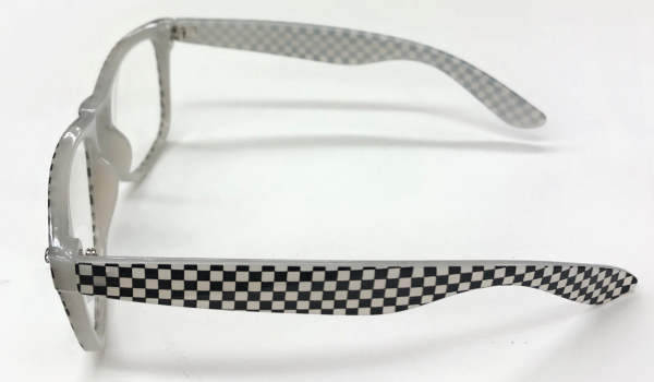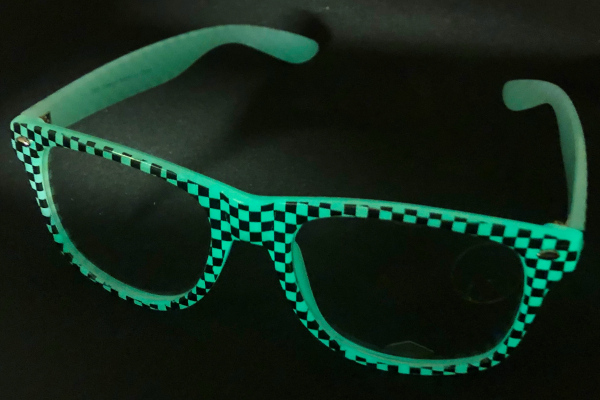 Checkered-pattern drifter eyeglasses, now glow in the dark! These glasses have transparent frames with a black checkered pattern, and they glow a bright green when the lights come off or the black-light’s on! Adult size.