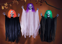 This hanging Reaper glows in the dark and has eyes that light up the same color as the hair. It is 36″ long and comes in assorted colors. This is a good looking prop.